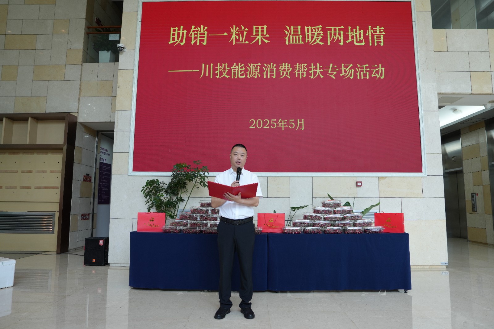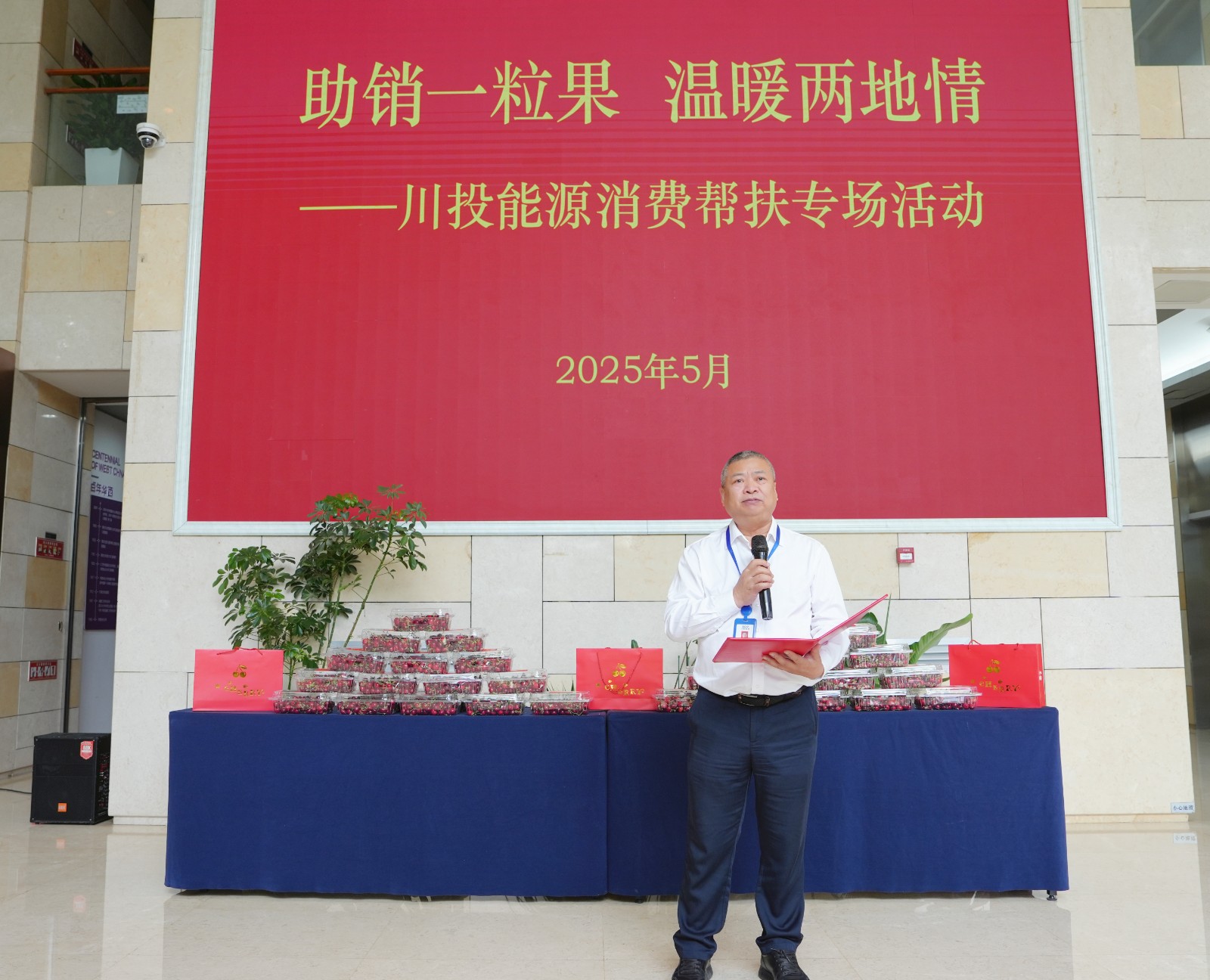 杨洪代表AG真人向参加活动的仪陇县、马鞍镇、福临乡一行人员表达感谢和欢迎,他表示,今天的活动不仅是为滞销车厘子“找出路”,更是为乡村振兴“拓新路”,AG真人将以本次活动为起点,一如既往做好托底性帮扶工作,强化党建引领,统筹要素保障,加强全面对接,让帮扶从“一时解困”走向“长期共赢”。