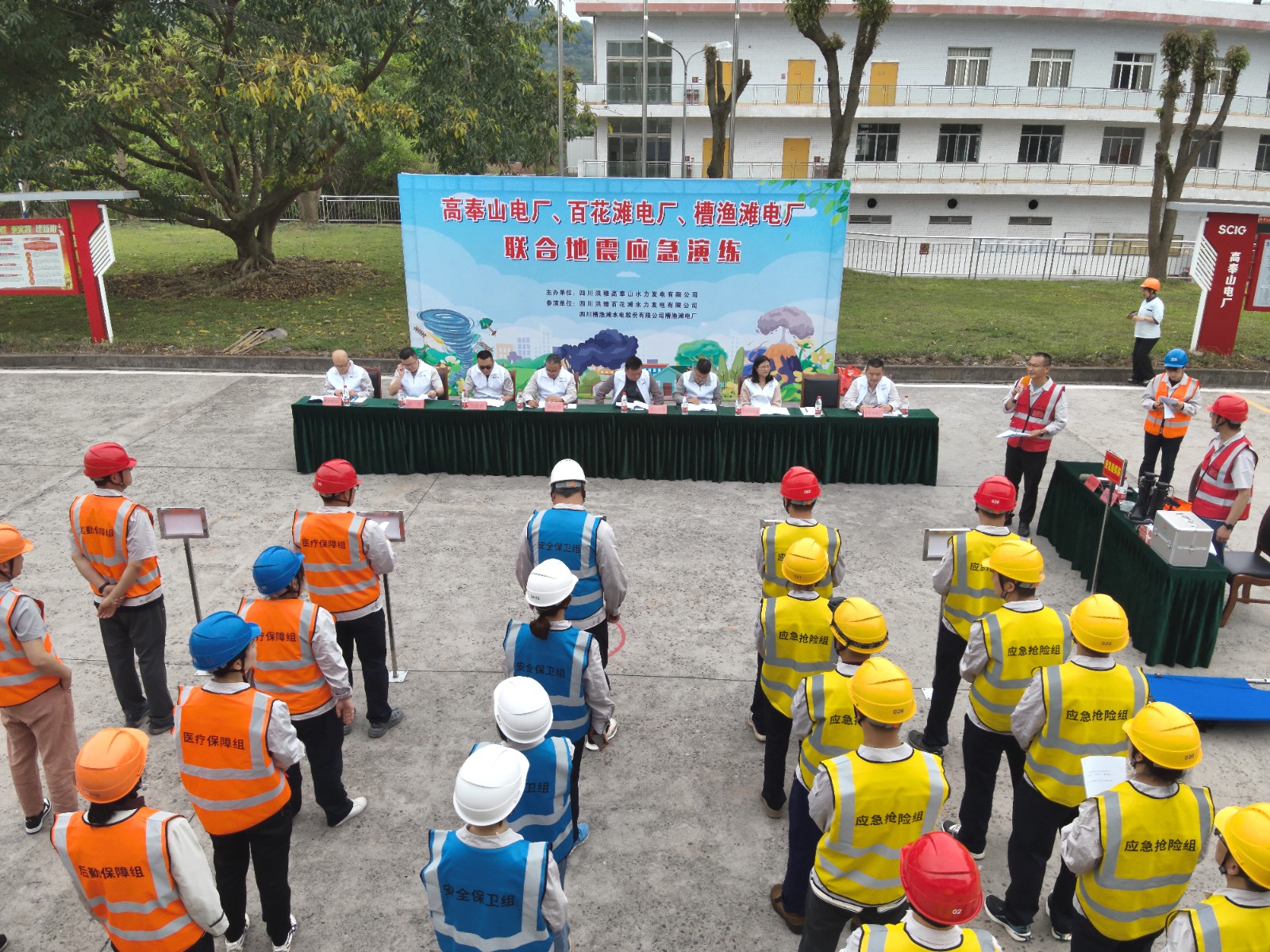 川投电力公司相关部门人员,高奉山电厂、百花滩电厂、槽渔滩电厂共计44人参加现场演练。此外,川投电力所属天彭电力、玉田电厂、脚基坪电厂等也组织开展了防灾减灾应急演练。