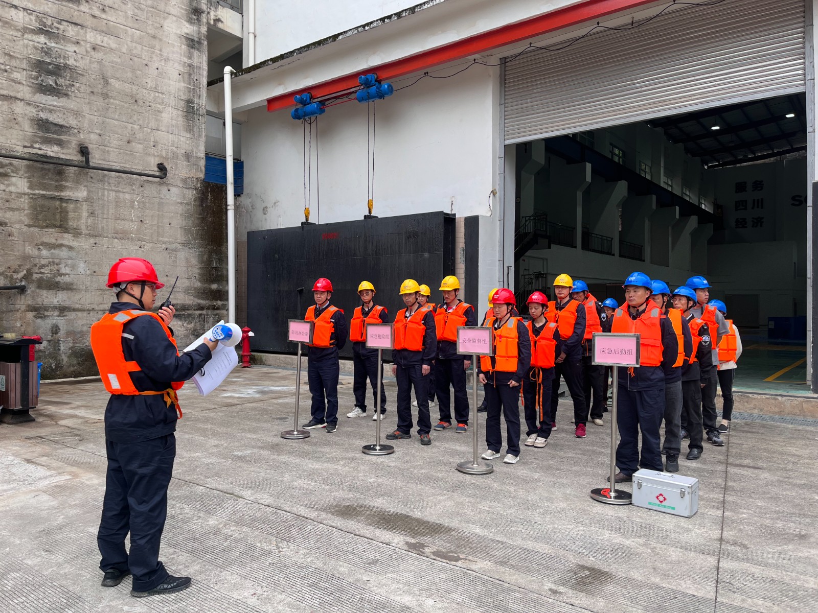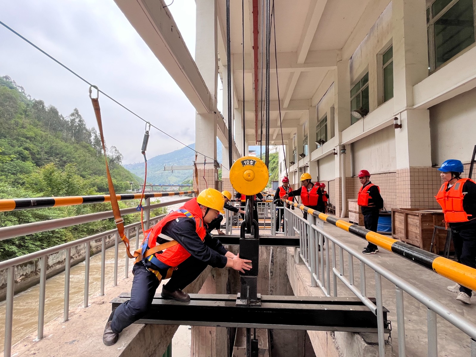 演练前,电厂组织全员学习了《玉田电厂2025年防洪度汛应急演练方案》,演练于14时30分正式开始,模拟玉田电厂三台机组带负荷93MW,越西县气象部门发布暴雨橙色预警,越西县降暴雨已持续数小时。上游宏阳电站和团结电站准备停机避峰已开闸放水,尼日河道来水凶猛,预计来水流量达到800m³/s,闸首水位1274.5m的紧急情况。当值值长接到汛情后,迅速汇报防汛办负责人。防汛办负责人要求控制好水位,确保人员安全,并准备停机避峰。随后,险情立即上报至防汛总指挥,总指挥接到险情后,立即启动《玉田电厂防汛抢险应急预案》,成立现场指挥部,统筹调度防汛办公室、安全督导组、应急抢险组、应急后勤组等多支队伍。大坝值班人员接到通知后拉响防洪警报,开启冲砂闸和泄洪闸缓慢放水,控制水位,同时做好防汛物资准备,并启动柴油发电机。当班值长向调度申请停机避峰,并及时向相关部门及下游电站通报汛情。三台机组停机后,逐步开启冲砂闸和泄洪闸进行泄洪。应急抢险组完成了厂房柴油发电机启动试验,落下机组尾水闸门,关闭主厂房防洪门并堆砌防洪沙袋。运行值班人员加强设备和边坡巡查。后勤组负责人员疏散和后勤保障工作。各小组协同作战,演练于15时49分圆满结束。